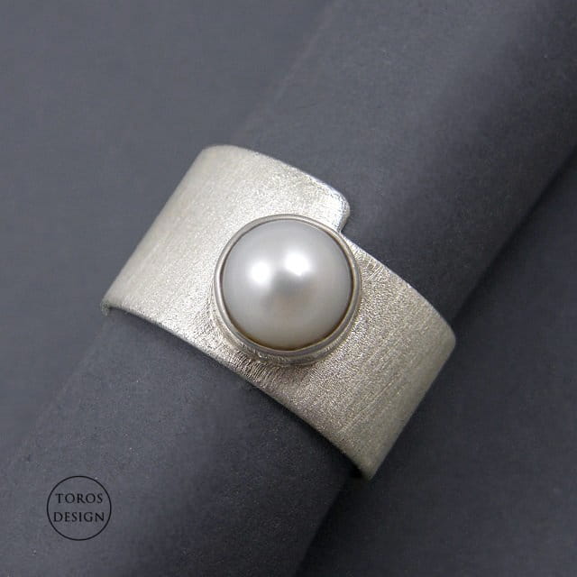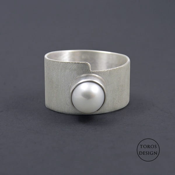 Pierścionek z naturalną perłą hodowlaną. Wykonany ręcznie ze srebra próby 925.