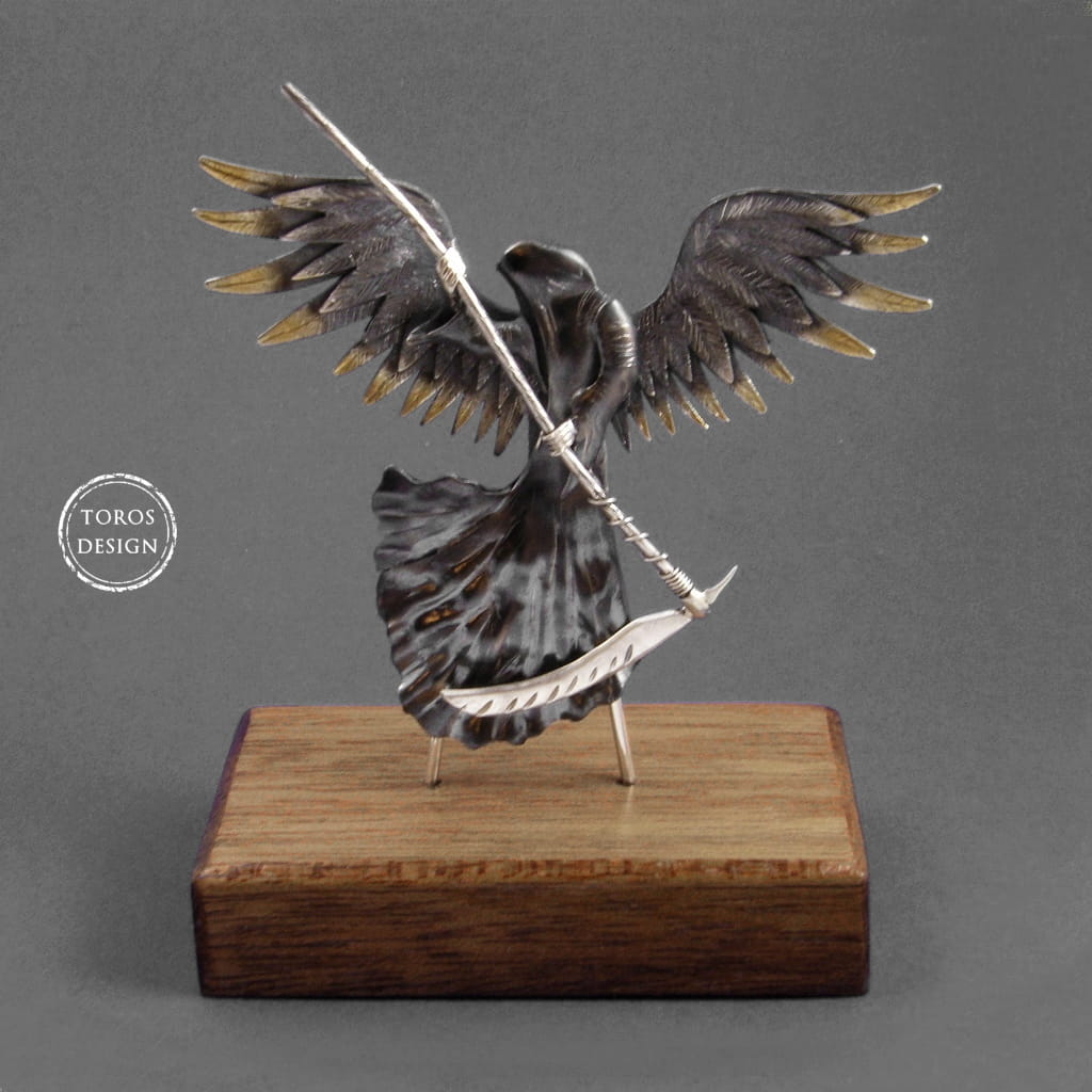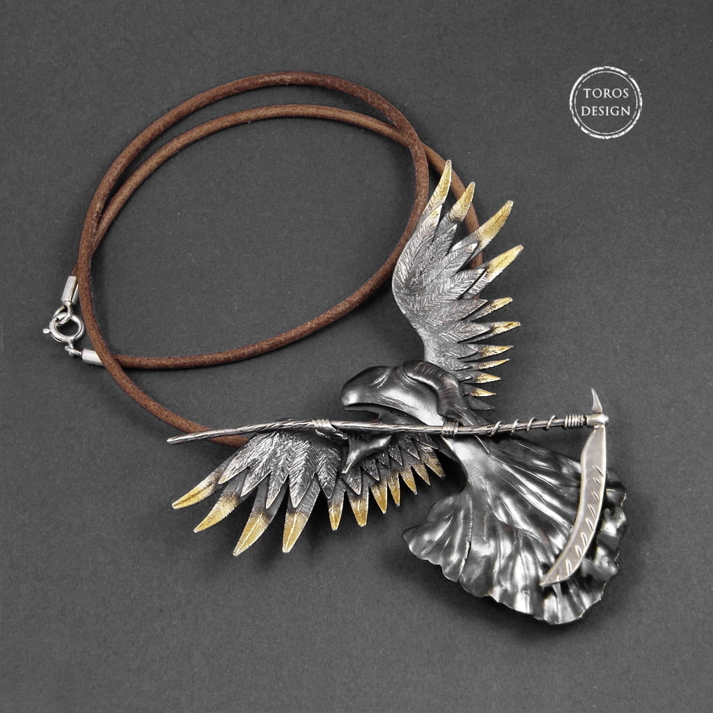 Wykonany ręcznie ze srebra próby 925. Zawieszony na rzemieniu. Oksydowany i nabłyszczany, końcówki piór są pozłacane. Wisior można postawić jako ozdobę, dzięki dołączonej drewnianej podstawie.