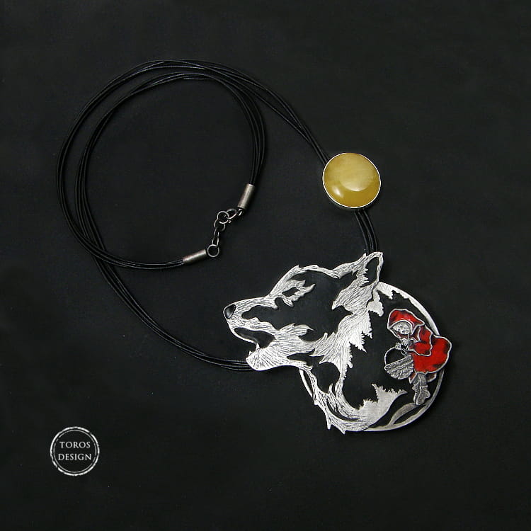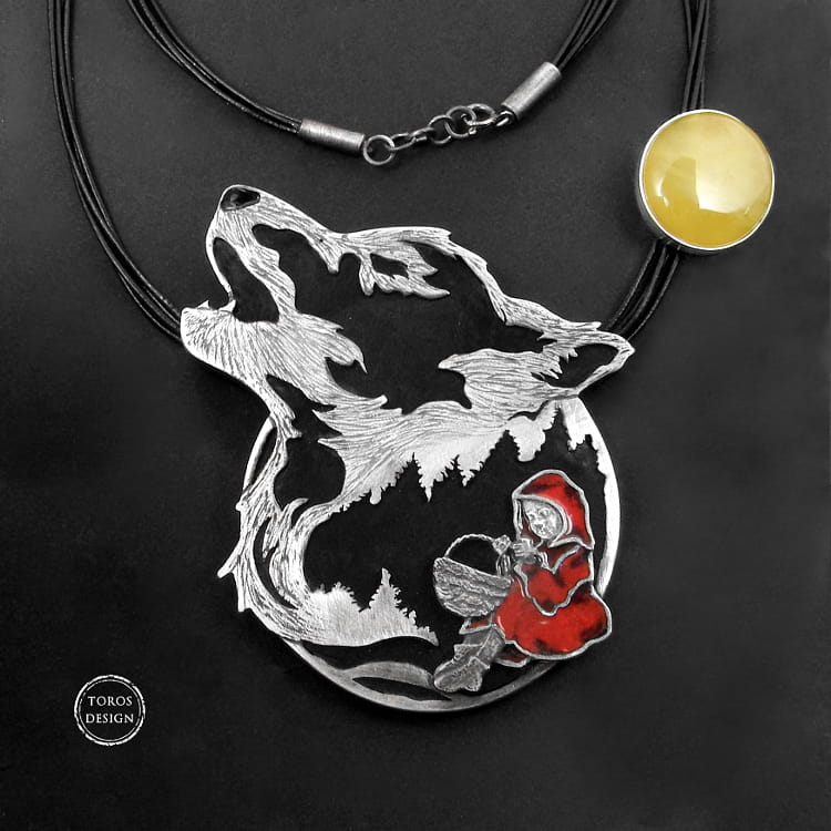 Czerwony kapturek to wisiorek opowiadający historię z jednej z najbardziej znanych bajek dzieciństwa. Postać dziewczynki wyróżnia się mocnym kolorem, chociaż jednocześnie jest drobnym, delikatnym elementem wobec górującego wilka.