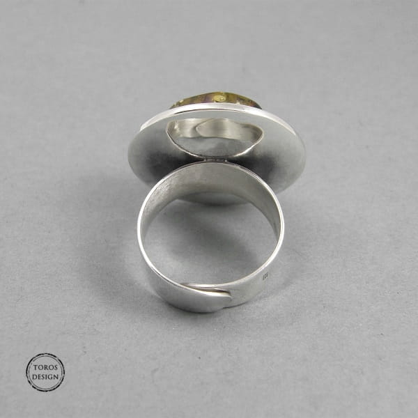 Wykonany ręcznie ze srebra próby 925. Powierzchnia wokół kamienia delikatnie młotkowana. Całość oksydowana i polerowana.