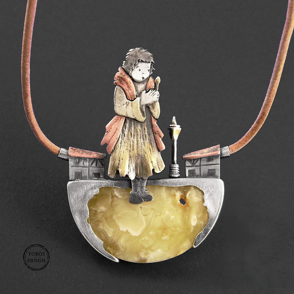 Bajkowy wisior przywołujący dzieciństwo i jego prostotę. Smutna bajka przypominająca o potrzebie miłości i bezpieczeństwa. Ujęta w piękną oprawę z imponującym żółtym bursztynem w roli głównej.