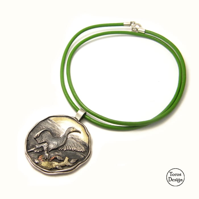 Wisiorek ukazuje wspaniałego i dumnego kormorana przygotowującego się do lotu. Piękno i doskonałość natury zostały tu zamknięte w symetrycznej formie medalionu.
