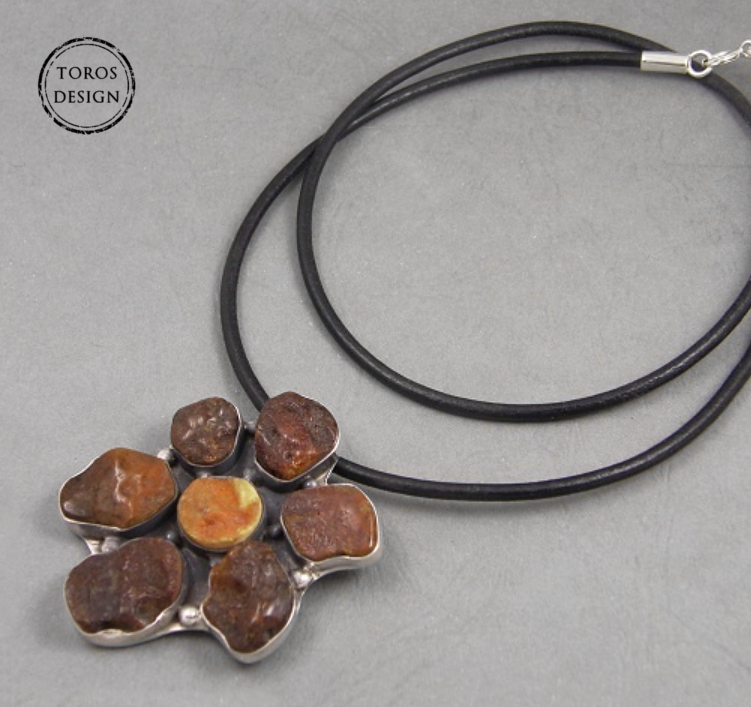 Srebrny naszyjnik na rzemieniu - duży kwiat z bursztynów