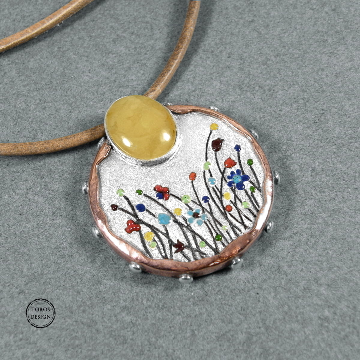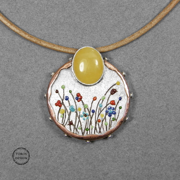 Wisiorek wykonany ręcznie ze srebra próby 925 i miedzi. Korony kwiatów to emalia jubilerska.