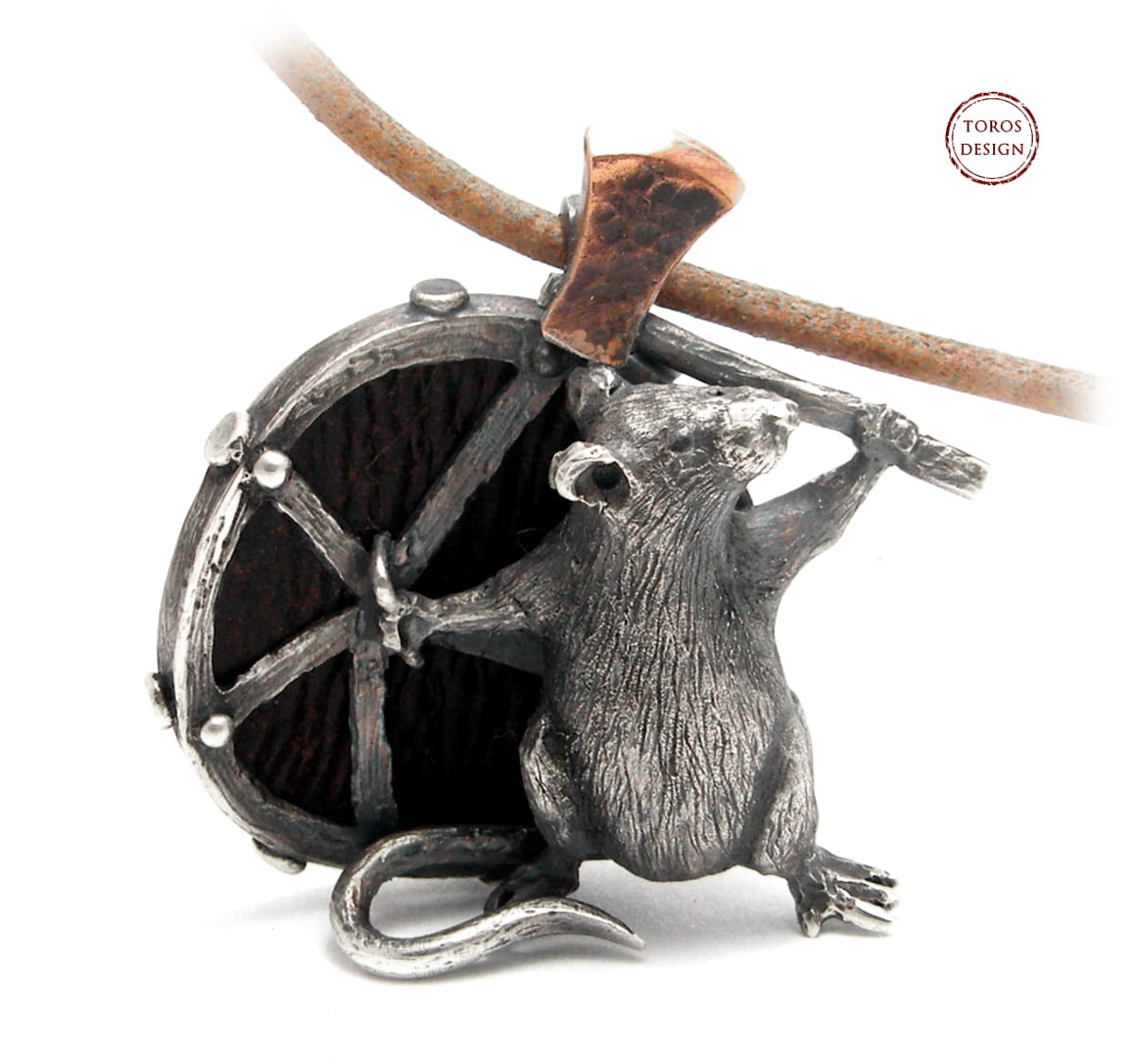 Postać szczurka została odlana w srebrze z ręcznie wyrzeźbionego wosku. Cały wisiorek wykonany jest ręcznie. Tarcza wypełniona skórą, toporek jest miedziany.
