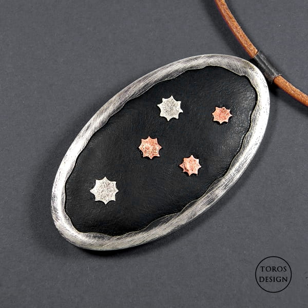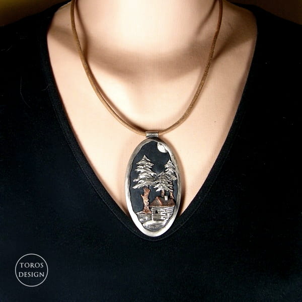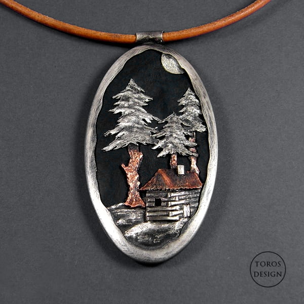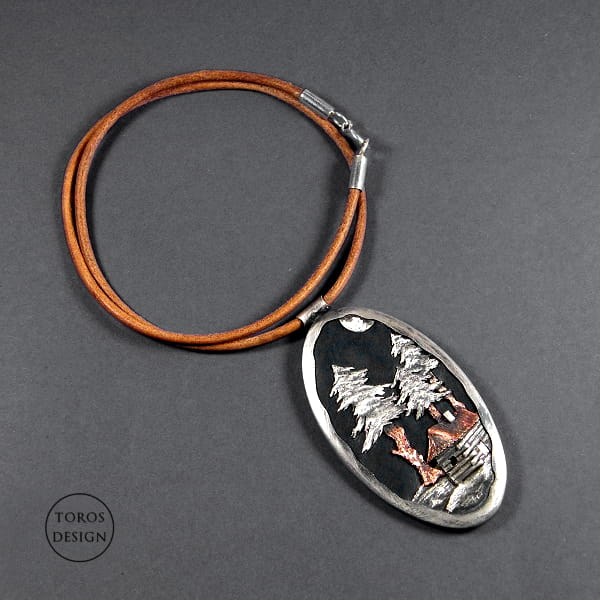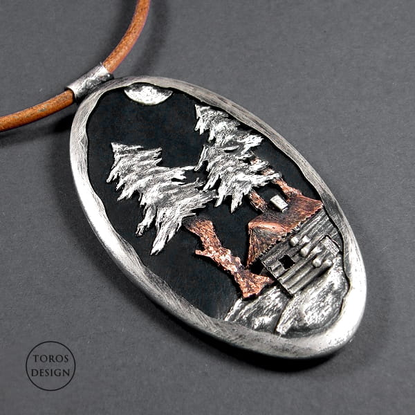 Wisiorek został wykonany ręcznie ze srebra, miedzi i skóry. Las i chatka są wycięte i polutowane z drobnych elementów i wyfrezowane do odpowiedniego kształtu.