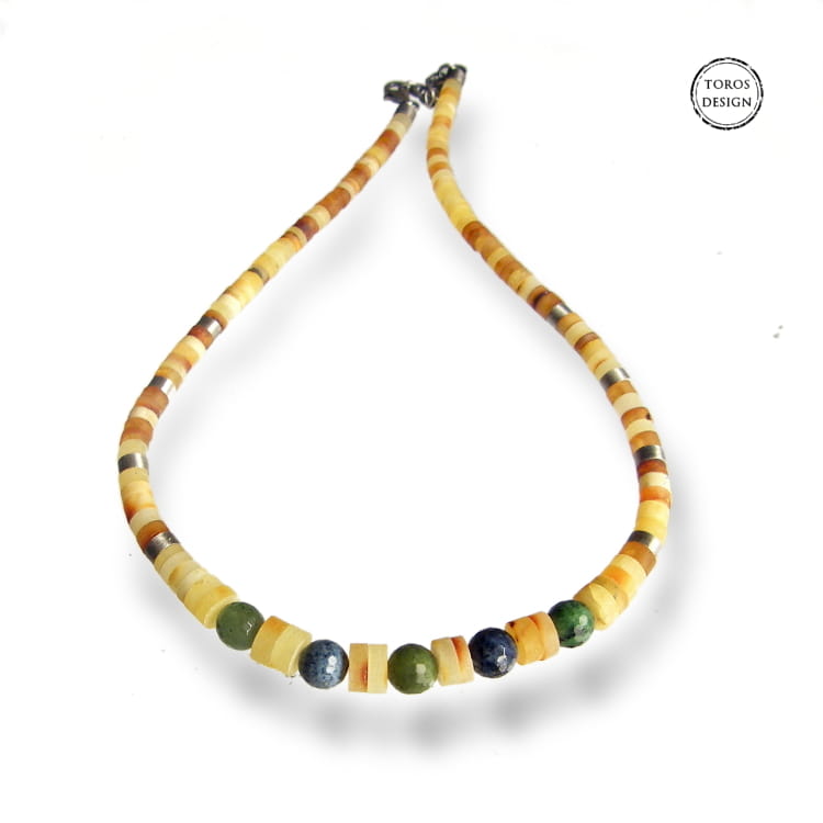 Bursztyn jest surowy, szlifowany. Do naszyjnika dodane zostały kolorowe, fasetowane kulki zoisytu, dumortierytu i nefrytu,oraz srebrne przekładki.