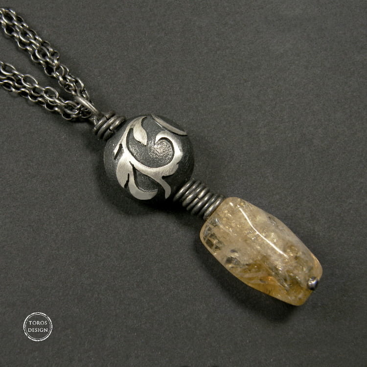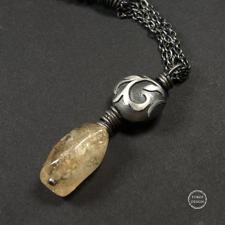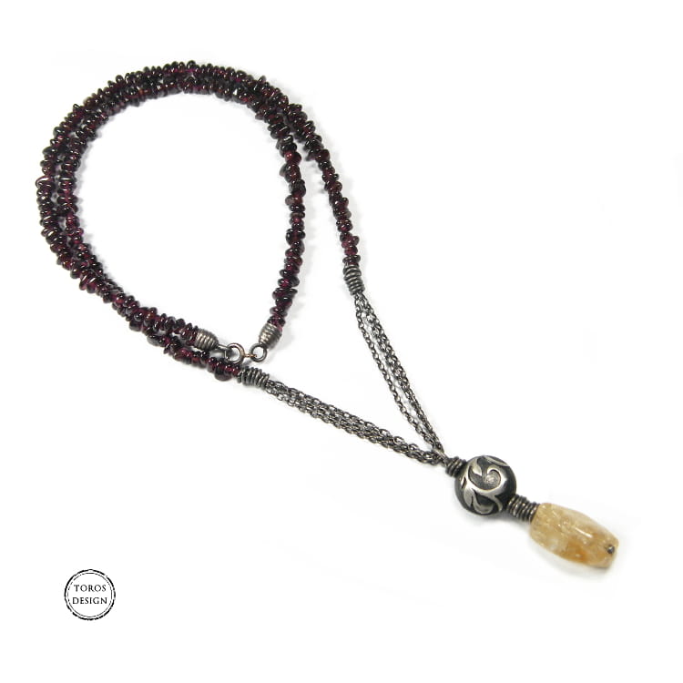 Wisiorek został wykonany ręcznie ze srebra próby 925. Srebro jest matowane i oksydowane. Z zawieszonym cytrynem i granatami w łańcuszku.