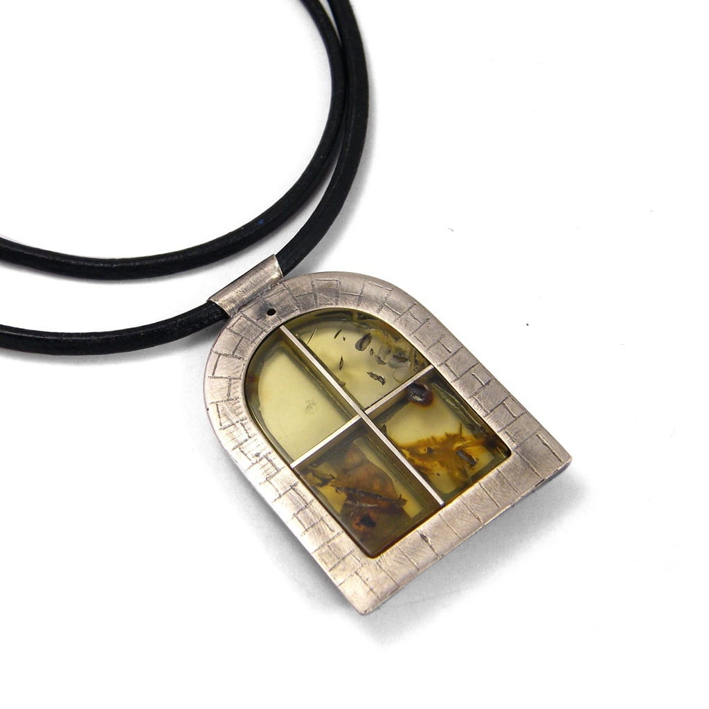 Wisiorek został wykonany ręcznie ze srebra, miedzi i bursztynu. W miejsce szybek wstawiłem naturalny, przejrzysty bursztyn.
