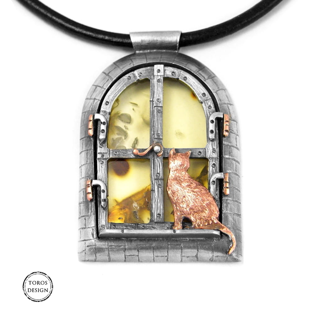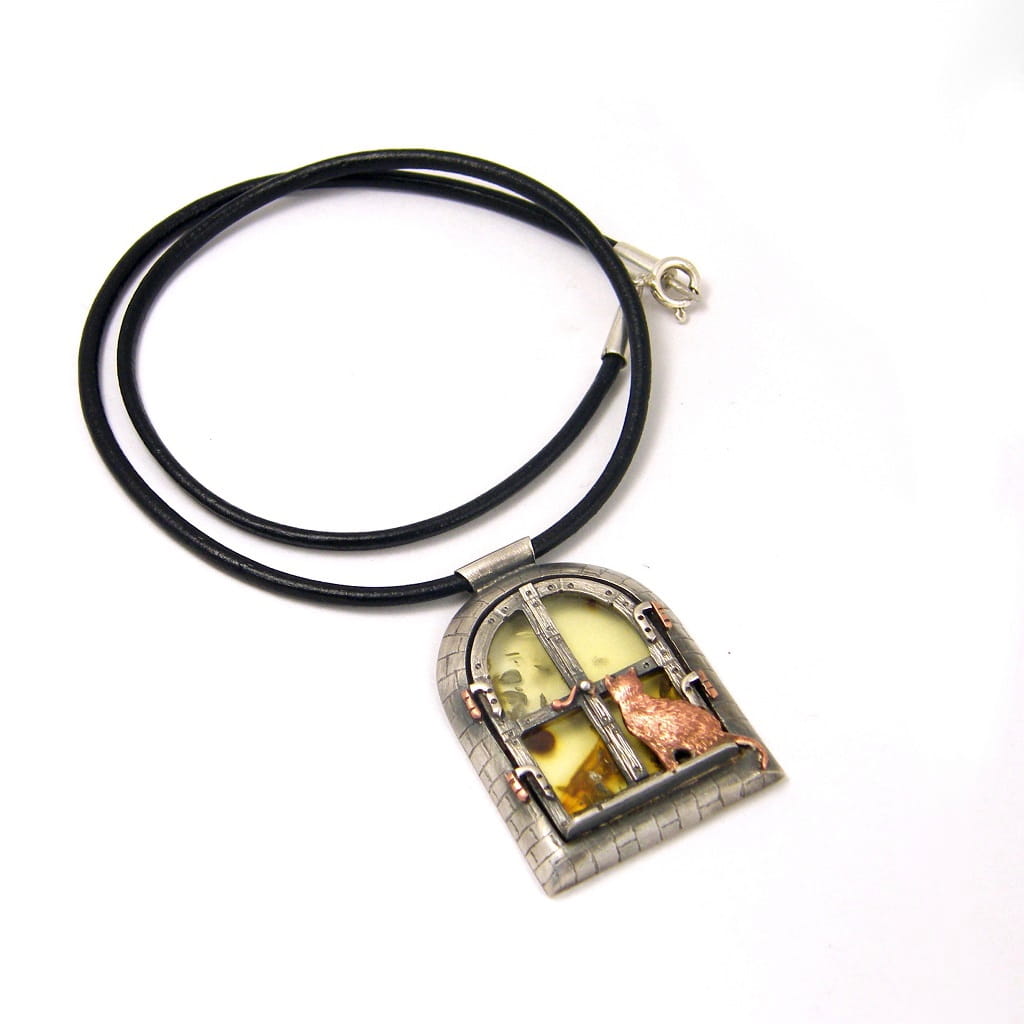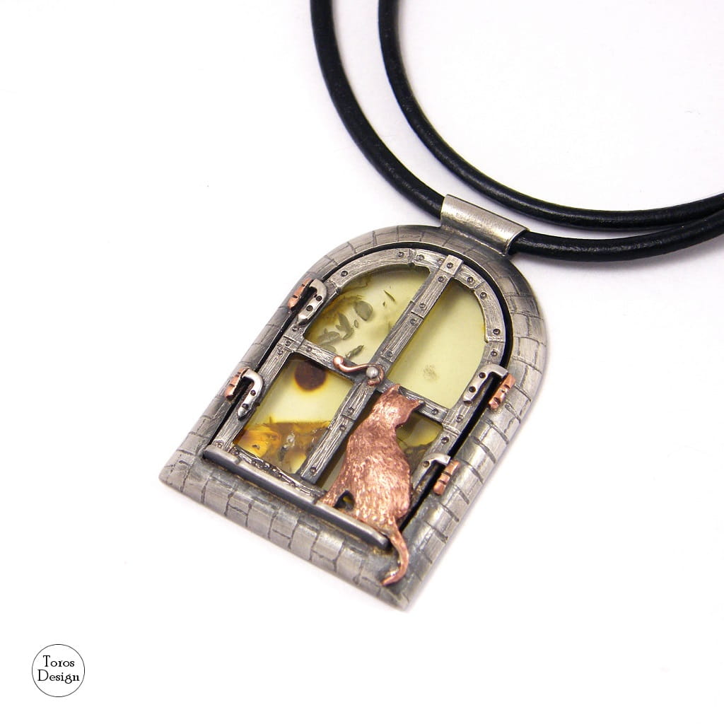 Piękny bajkowy wisior. Bardzo nostalgiczny i bajkowy. Tajemnicze ono, na którym siedzi kot. Rudy kotek wyrzeźbiony z miedzi obrazuje tęsknotę za wolnością - a może tylko ciekawość świata? Naturalne inkluzje w bursztynie tworzą wrażenie cieni zza szyb.