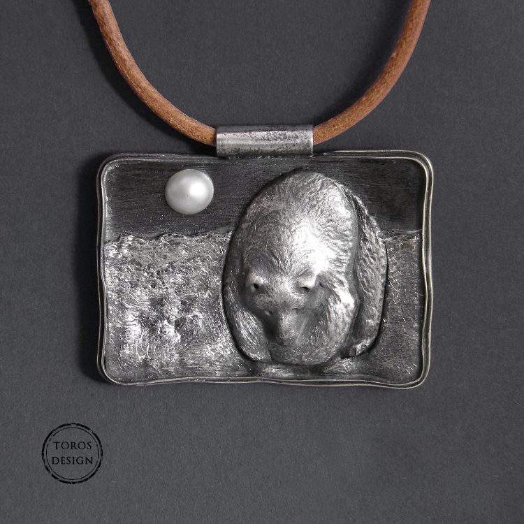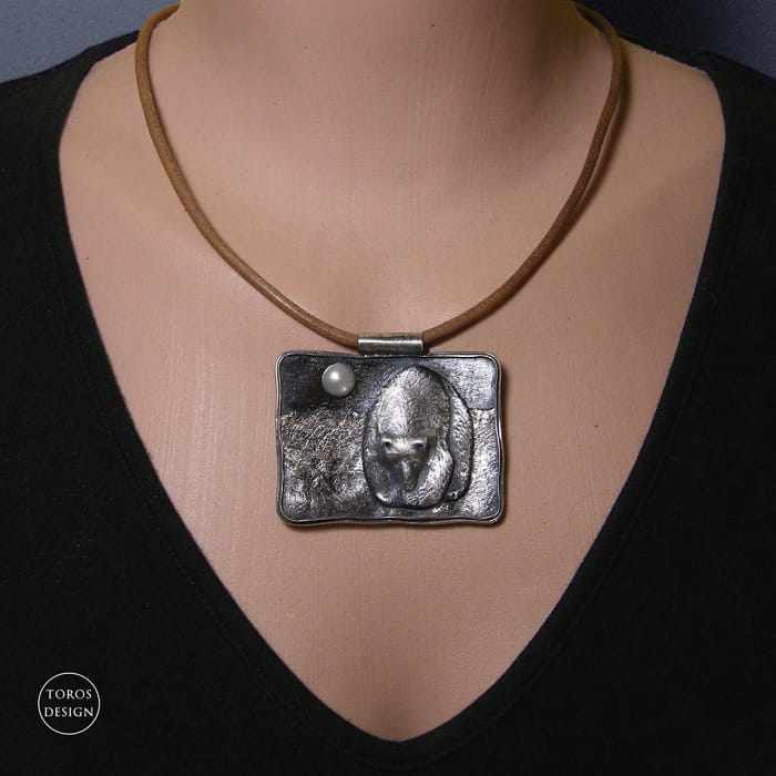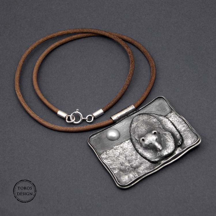 Wykonany ręcznie ze srebra próby 925, zawieszony za rzemieniu. Cała postać niedźwiadka została wyrzeźbiona w srebrze. Wisiorek jest matowany, oksydowany i przepolerowany. Jako księżyc umieszczona została naturalna perełka.
