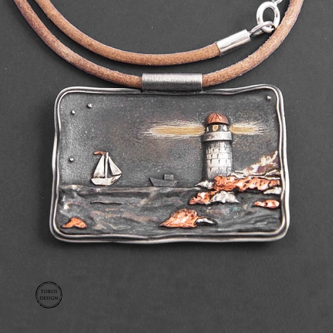 Wisiorek został wykonany ręcznie ze srebra próby 925 i z miedzi, zawieszony na rzemieniu. Całość krajobrazu z latarnią wyciąłem i polutowałem z drobnych srebrnych i miedzianych elementów. Wisiorek jest matowany, oksydowany, pozłacany i przepolerowany.