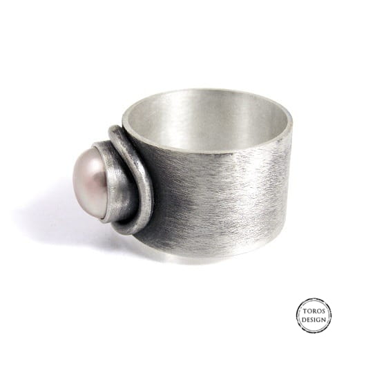 Szeroki pierścionek z perłą w kolorze delikatnego różu.