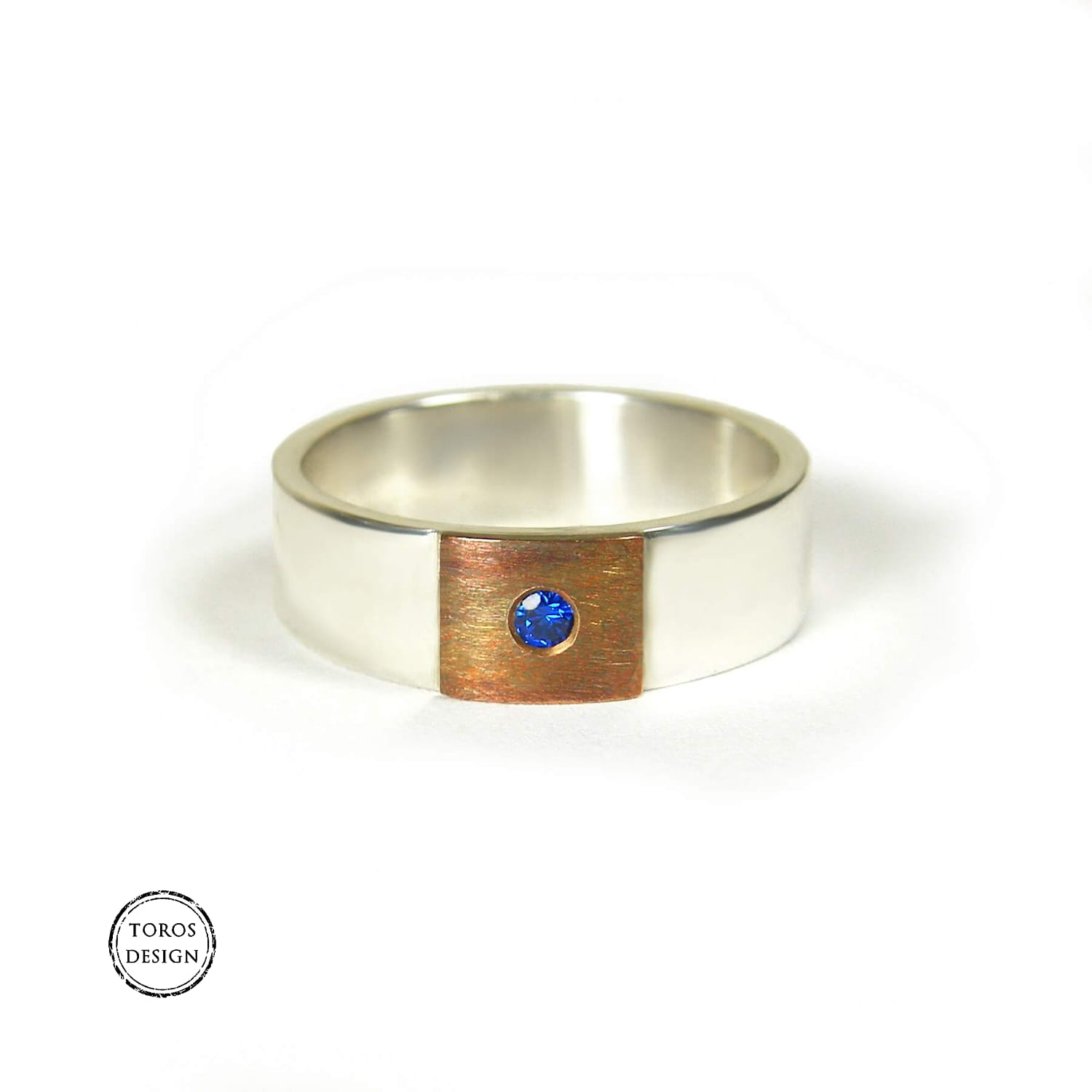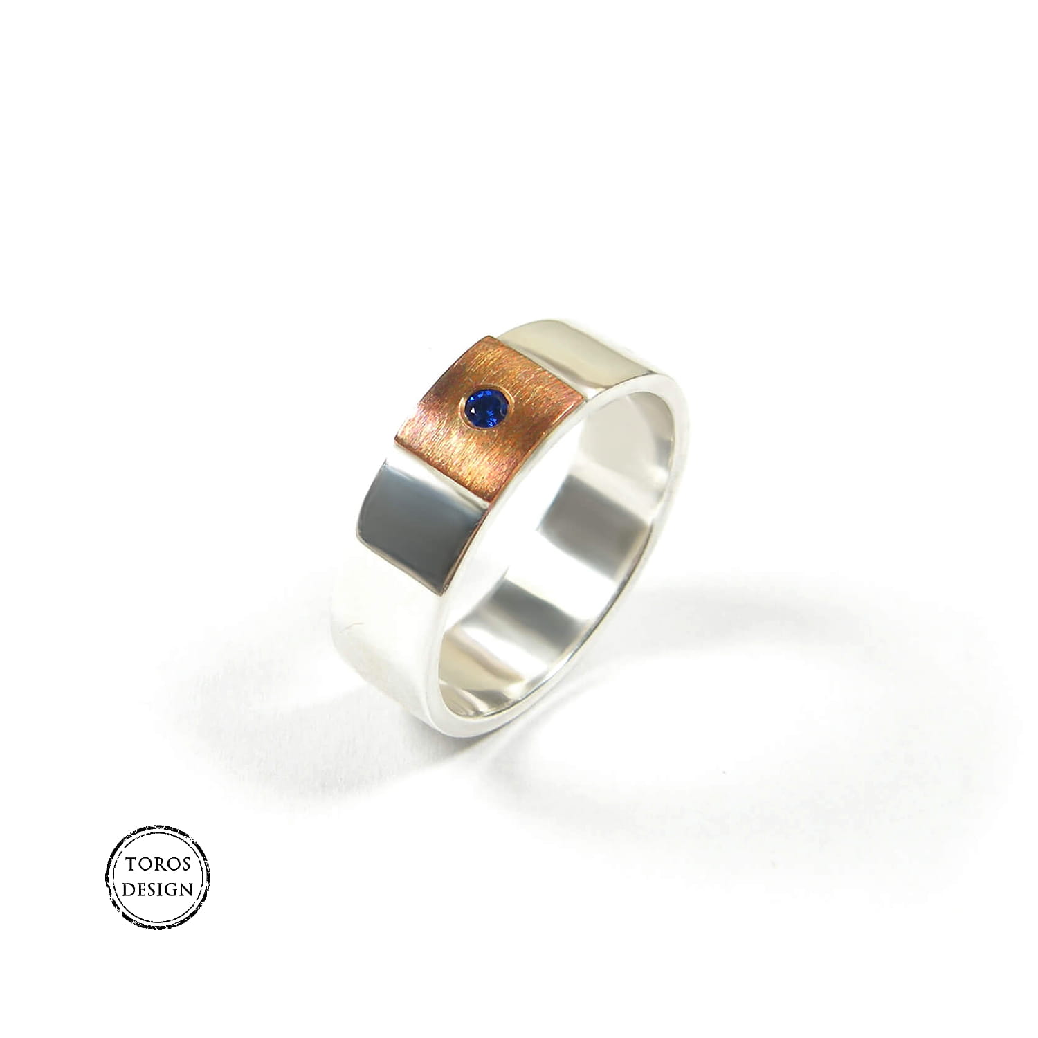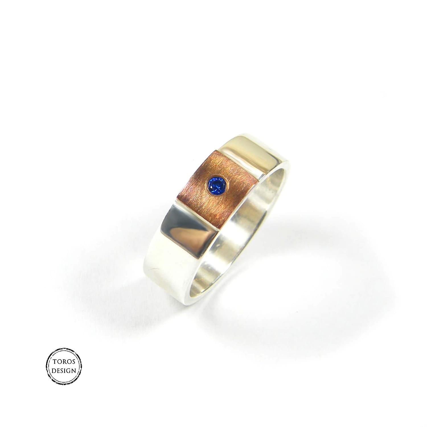 Ciekawa obrączka z miedzianą ze wstawką. Wypolerowana na wysoki połysk. Miedź jest zmatowiona i delikatnie patynowana. Obrączki są wykonywane ręcznie, cyrkonia jest zakuwana.