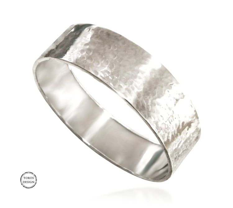 Bransoletka to szeroka, minimalistyczna w stylu ozdoba. Jedynym zdobieniem jest sama powierzchnia srebra. Wypolerowana i młotkowana na całej szerokości. Technika młotkowania nadaje bransolecie nieco surowości, a jednocześnie sprawia, że powierzchnia się mieni odblaskami. Dla kobiet ceniących prostotę i elegancję.
