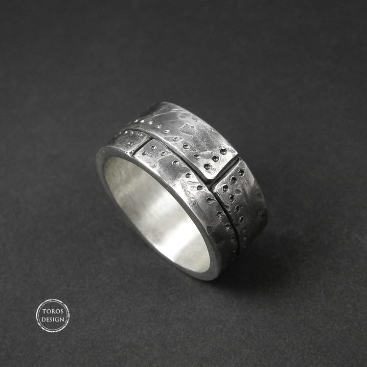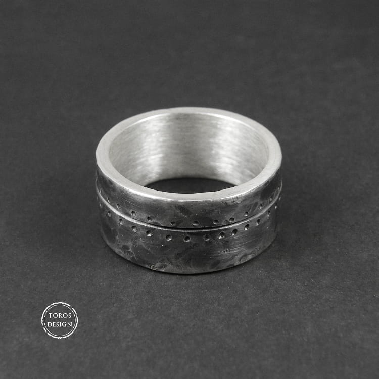 Obrączka została wykonana ręcznie ze srebra próby 925. Powierzchnia jest młotkowana i "poniszczona". Całość została zaoksydowana i delikatnie spolerowana.