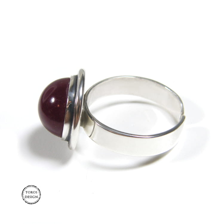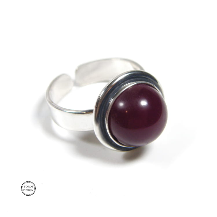 Wykonany ręcznie ze srebra próby 925. Srebro oksydowane i polerowane. Jadeit w ciemnym, rubinowym odcieniu.