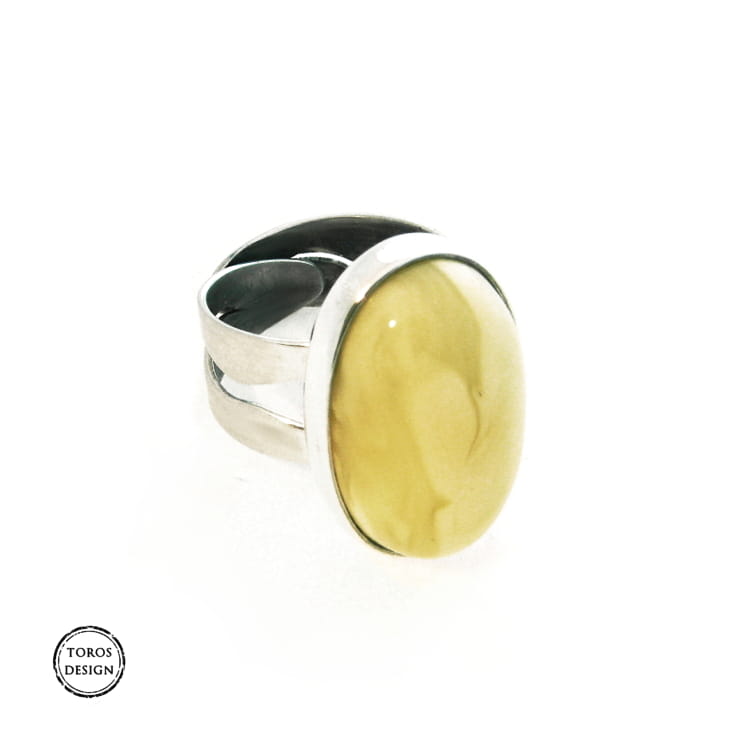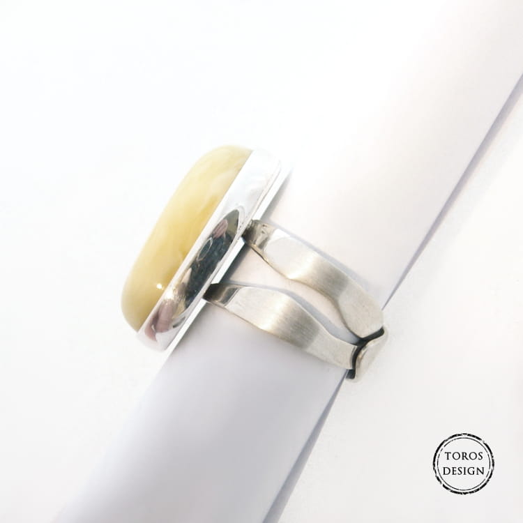 Pierścionek ma klasyczną, prostą oprawę, która podkreśla piękno bursztynu. Jest on tutaj główną ozdobą i zdecydowanie przyciąga wzrok.