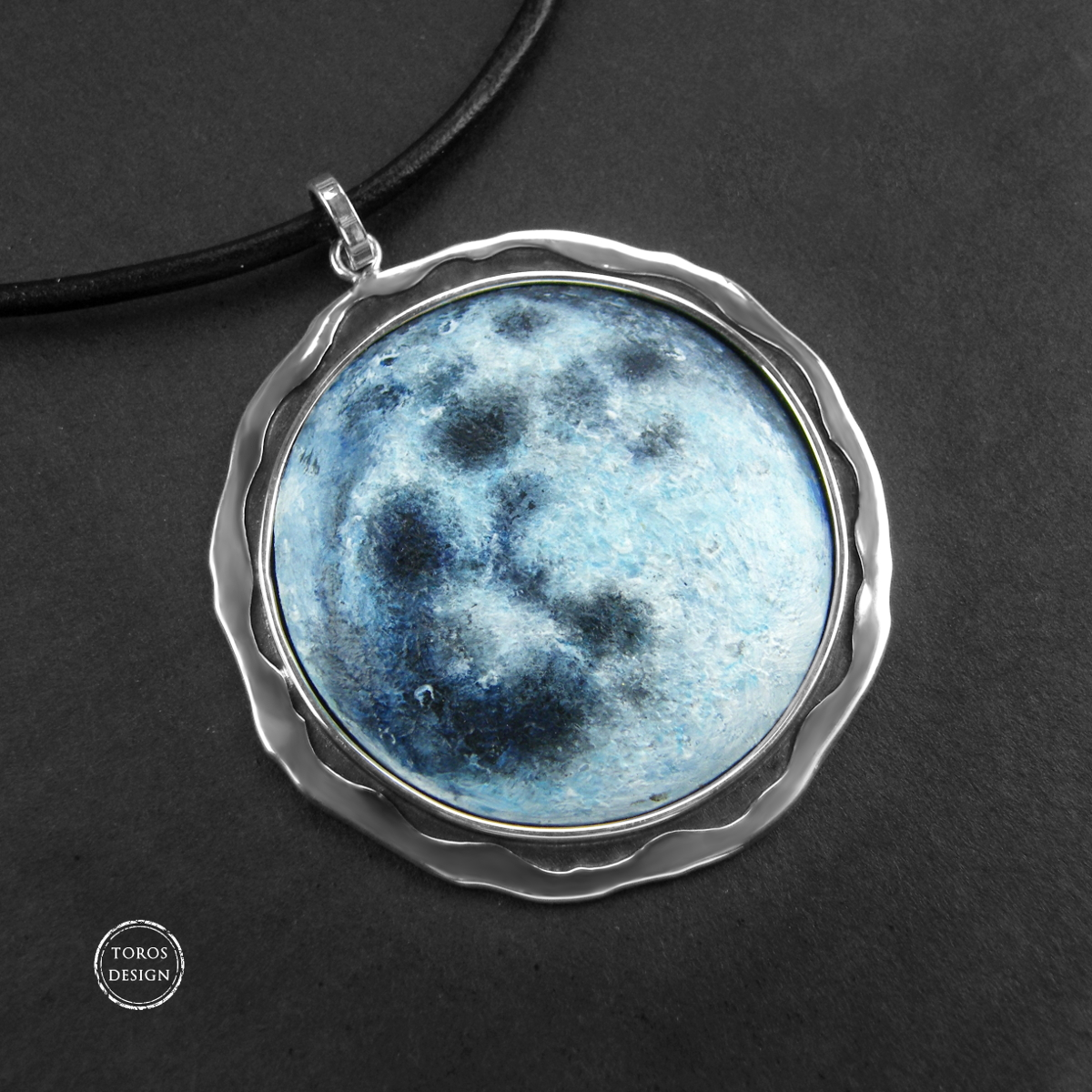 Księżyc został ręcznie namalowany na drewnie jesionowym. Jest zabezpieczony zabezpieczony woskiem. Oprawa wykonana została ze srebra i wypolerowana. Wisiorek jest zawieszony na rzemieniu.