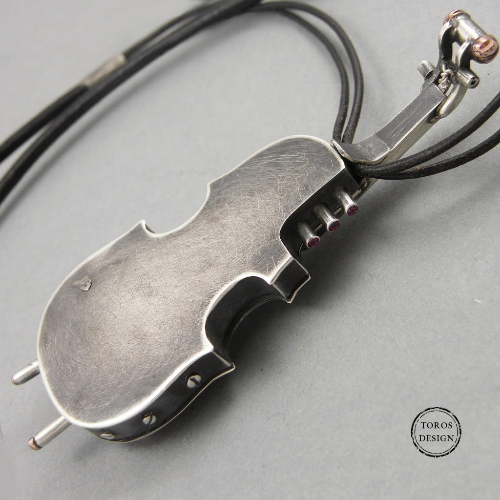 Wisiorek zrobiony jest ze srebra próby 925. Jako dodatków użyto rubinowych cyrkonii i miedzi. W gryfie skrzypiec zatopiony jest ciemny bursztyn. Srebro jest oksydowane i matowane.