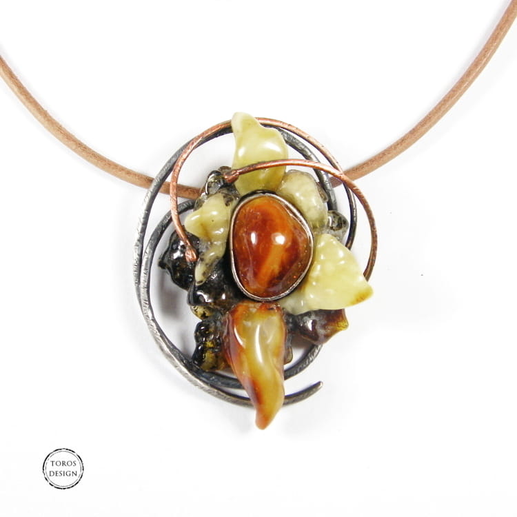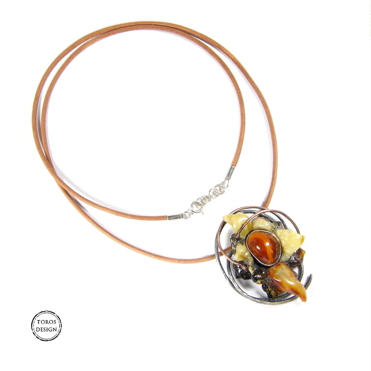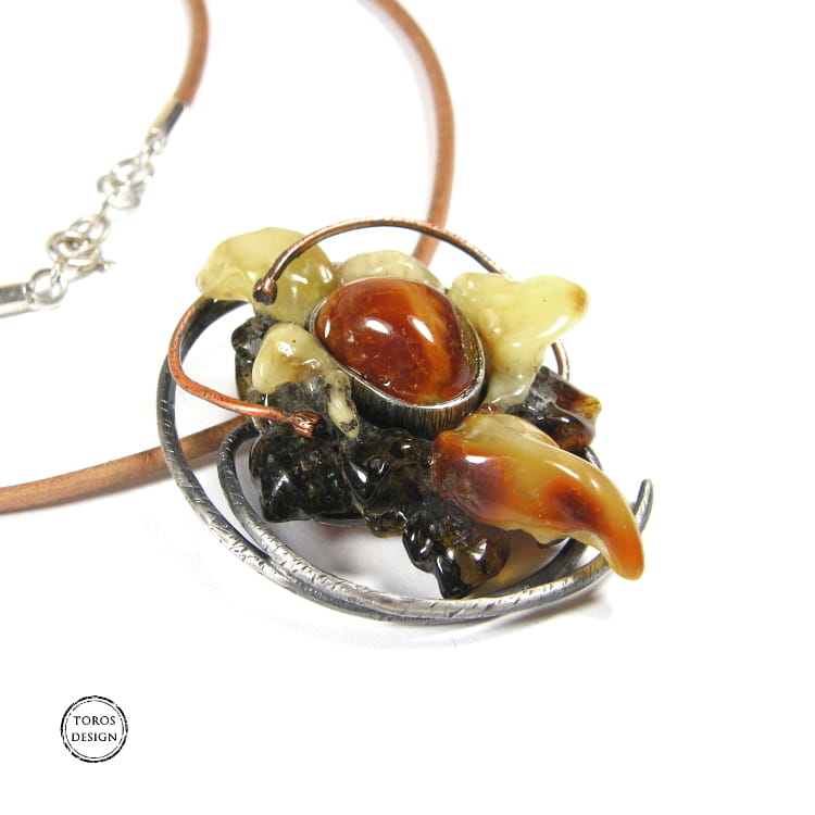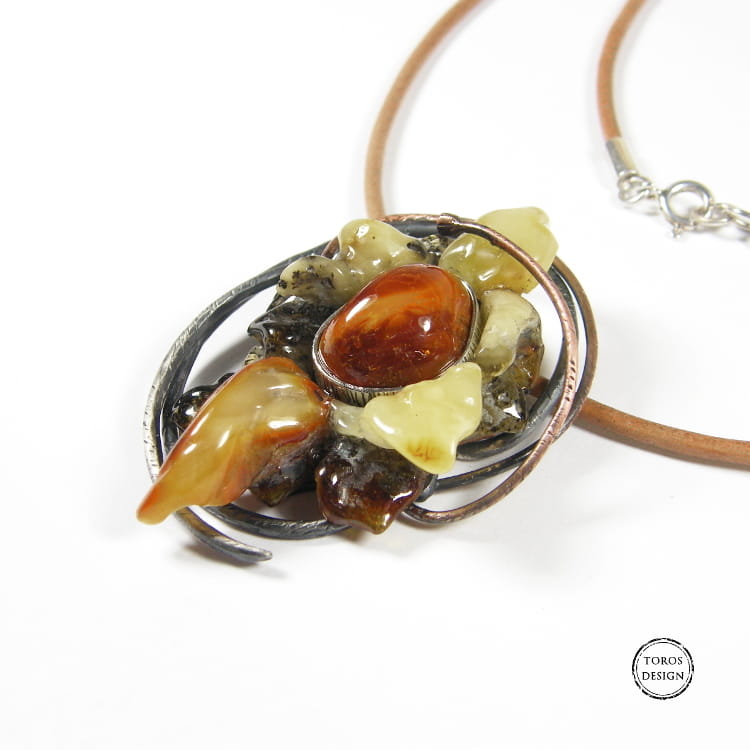 Uroczy i kobiecy wisiorek z pięknie wyrzeźbionym fantazyjnym kwiatem. Delikatna oprawa tylko jest dodatkiem do bursztynów, które graja kolorami i kształtami.