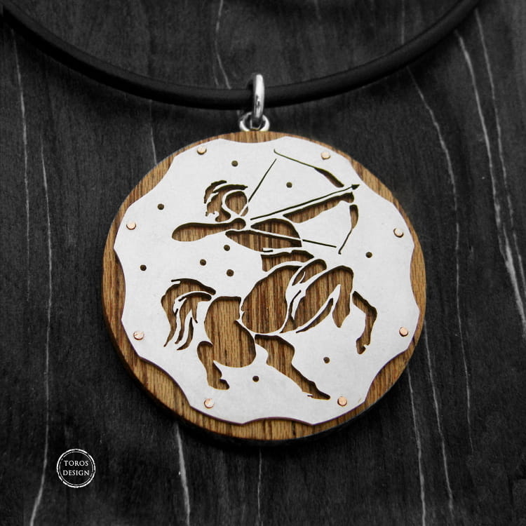 Strzelec - srebrny wisior na drewnie - znaki zodiaku