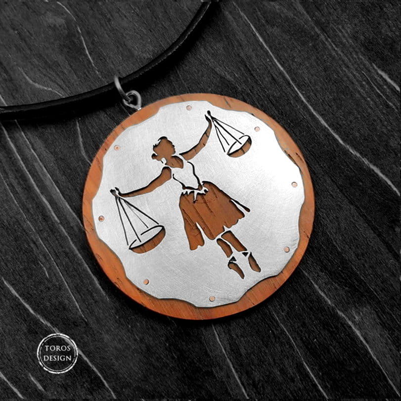 Waga - srebrny wisior na drewnie - znaki zodiaku