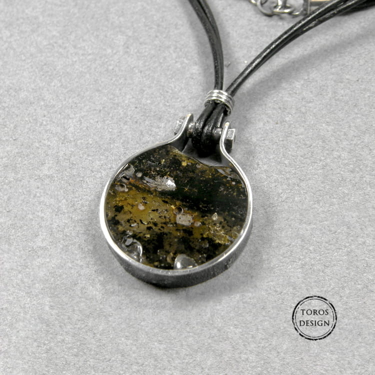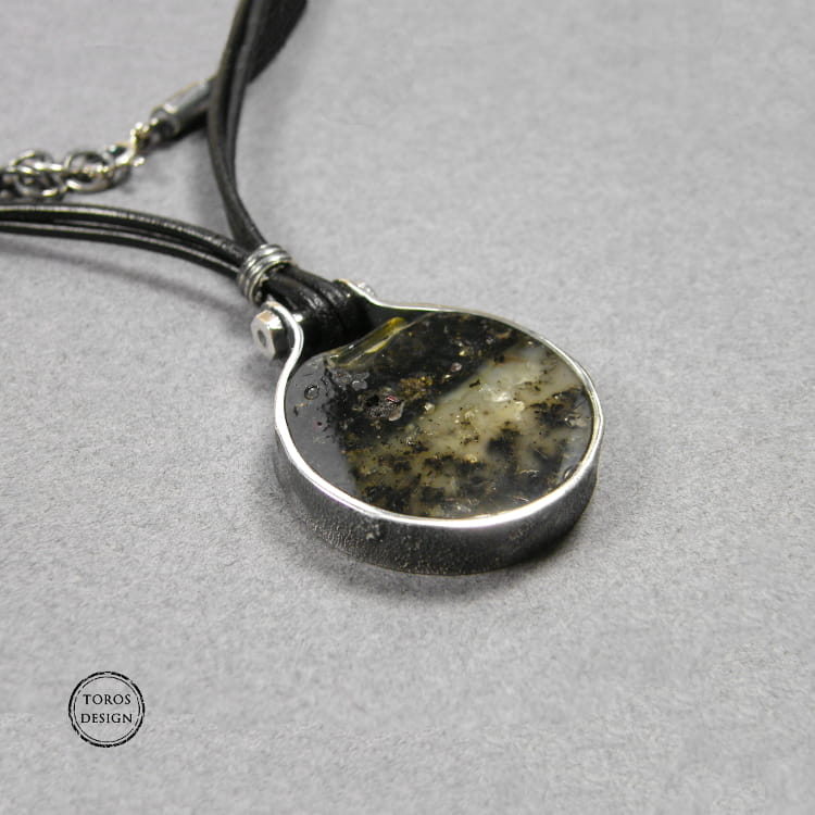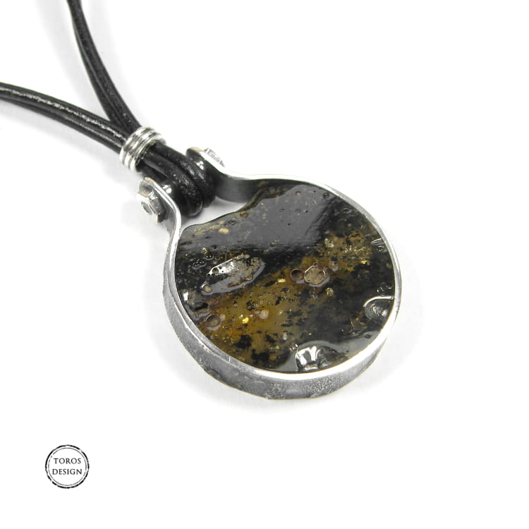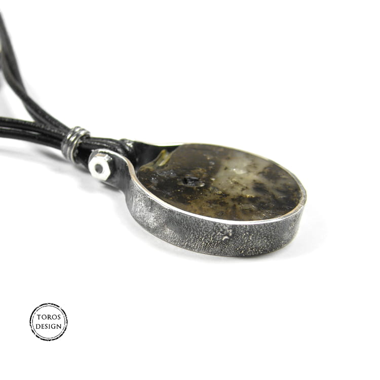 Oryginalny bursztyn o niespotykanej barwie i strukturze. Oprawa - chociaż oryginalna - jest tylko delikatną ozdobą, główną ozdobą jest kamień. Wypolerowany i wyszlifowany z obydwu stron pozwala na obustronne noszenie wisiorka.