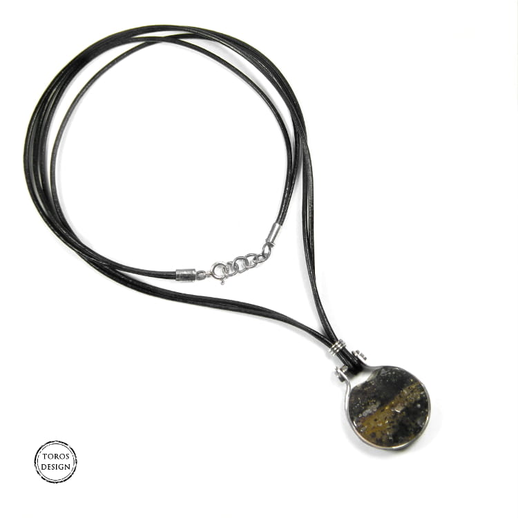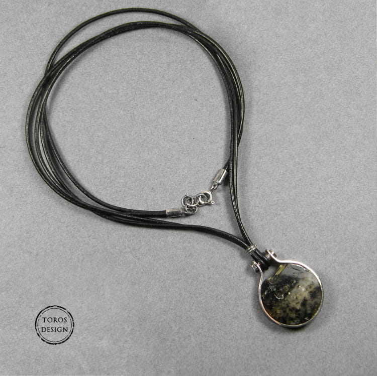 Wykonany został ręcznie ze srebra próby 925 i zawieszony na rzemieniu. Naszyjnik jest dwustronny.