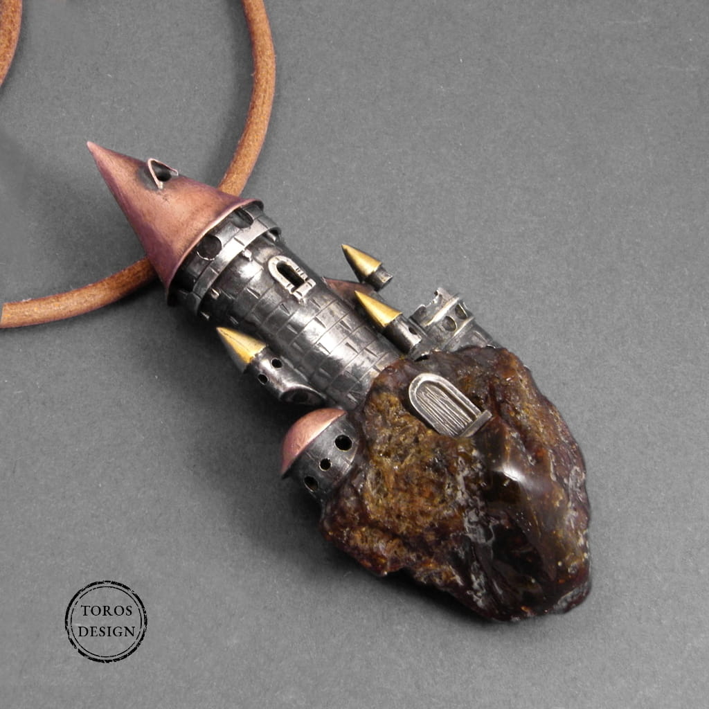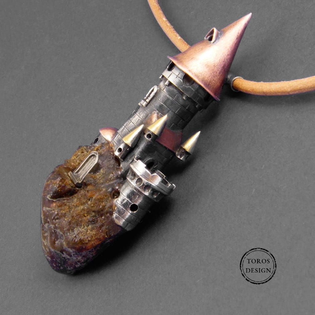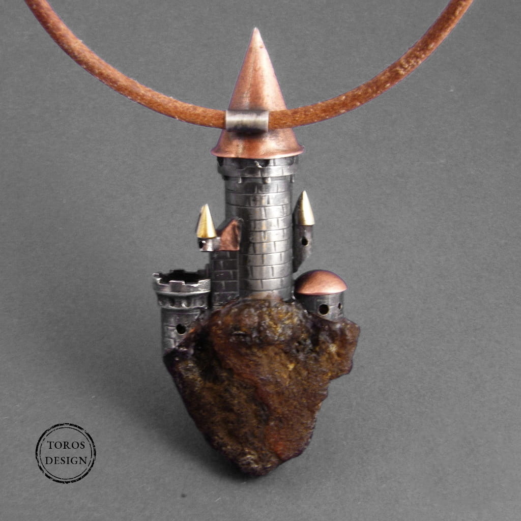 Wisiorek został wykonany ręcznie ze srebra próby 925 i miedzi. Budowla umieszczona jest na naturalnym bursztynie, który imituje skałę. Zamek został uformowany i polutowany ze srebrnej blachy i wielu drobnych srebrnych elementów.